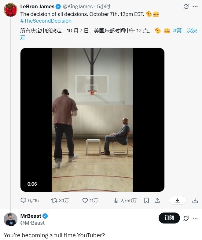 BasketballLeBron James suddenly updated the social media and wrote: "All decisions in the decisions, October 7, 12 noon East." The top overseas blogger Mr. Beast commented under James' news: "Are you going to transform into a full-time vide...