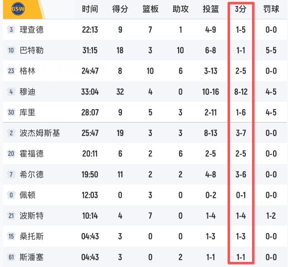 It is worth noting that Curry scored 1 three-pointer in this game. 11 people on the team scored three-pointers. Among them, Curry made 1 of 6 shots with the lowest shooting percentage!
