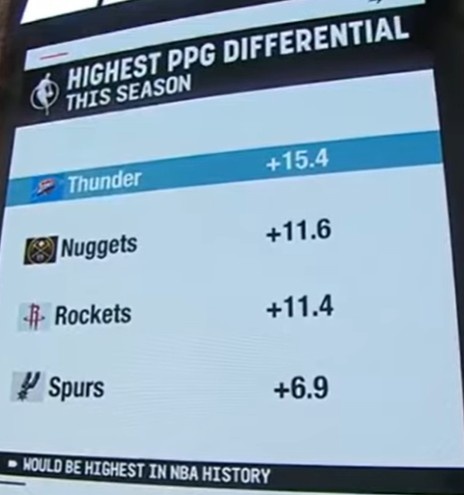 This season, the Thunder averaged +15.4 points per game, ranking first in the league, with the Nuggets and Rockets ranking second and third!