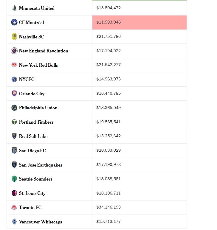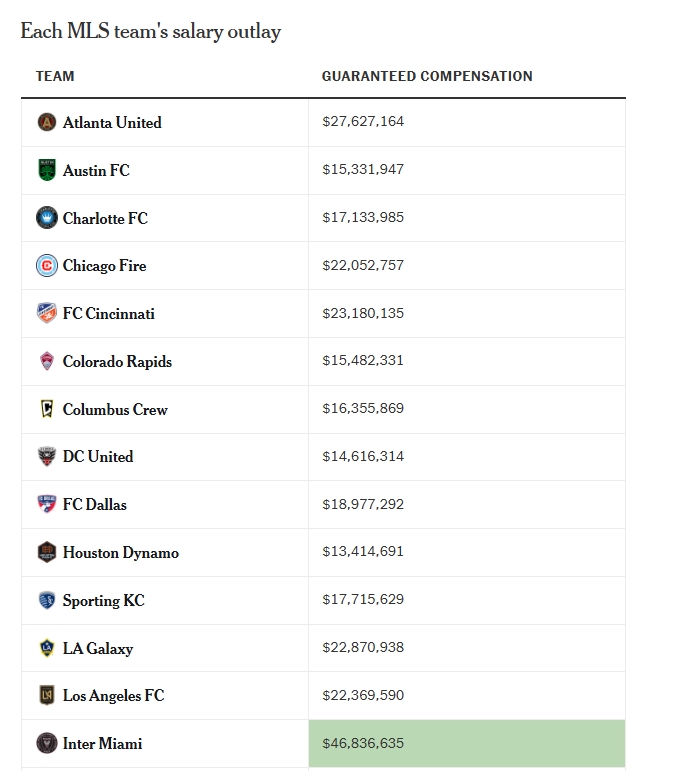 Miami International's total salary expenditure is $46836,635, and the second-spending team Toronto FC is $341,46,193.