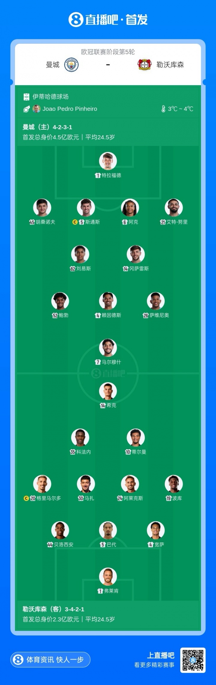 In the fifth round of the UEFA Champions League, Manchester City faced Bayer Leverkusen at home. The starting lineups of both sides were announced before the game. [Manchester City has made a substantial rotation in this game, with Malmouche, Reinders, and Husanov all starting, and Harland, Foden, and Seat B sitting on the bench. In terms of pharmaceutical companies, Schick, Grimaldo, and Kuanza started the game, and Ben Segier and Echeverry were on standby. 】