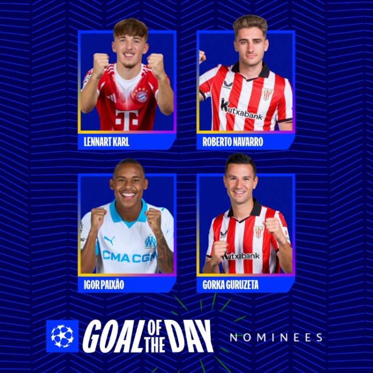 Candidates for the best goal of the day in the Champions League: Karl, R-Navarro, Guruzeta, Paisan are listed
