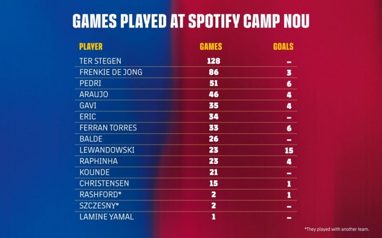 In the current lineup, four of the five captains occupy the top of the team's Camp Nou appearances list: Ter Stegen, Frenkie de Jong, Pedri and Araujo.
