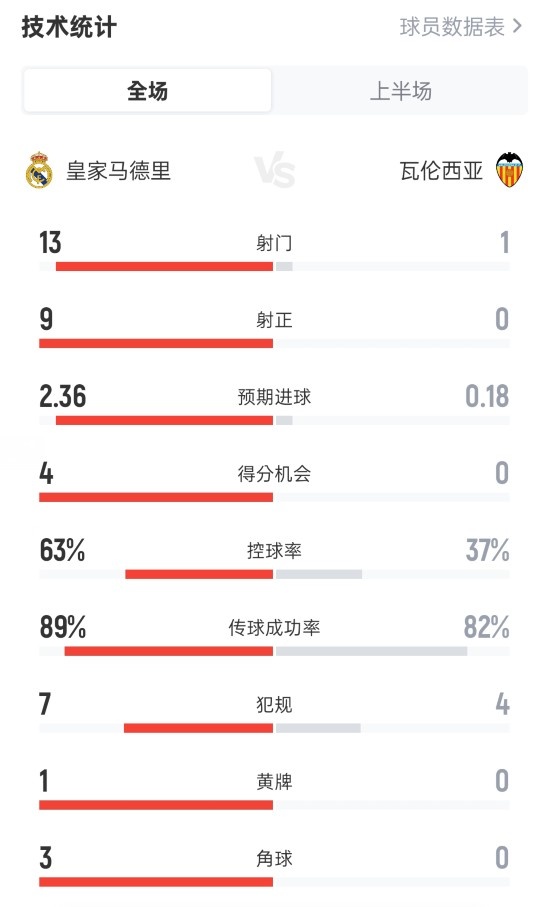 Crush! Real Madrid 3-0 Valencia at halftime: 13-1 shots, 9-0 shots on target, ball possession rate 63%-37%