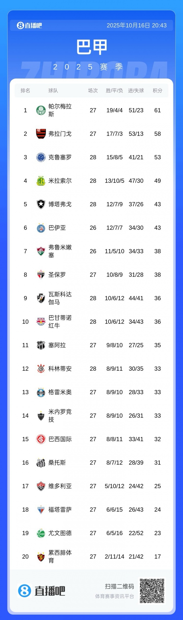 However, reality is far from vision. The team has only won one victory in the past five league games and lost 0-3 at home to Flamengo. This also means that the team has basically lost the possibility of winning the championship. Currently, the team is 18 points away from the top spot and has dropped to fifth place.