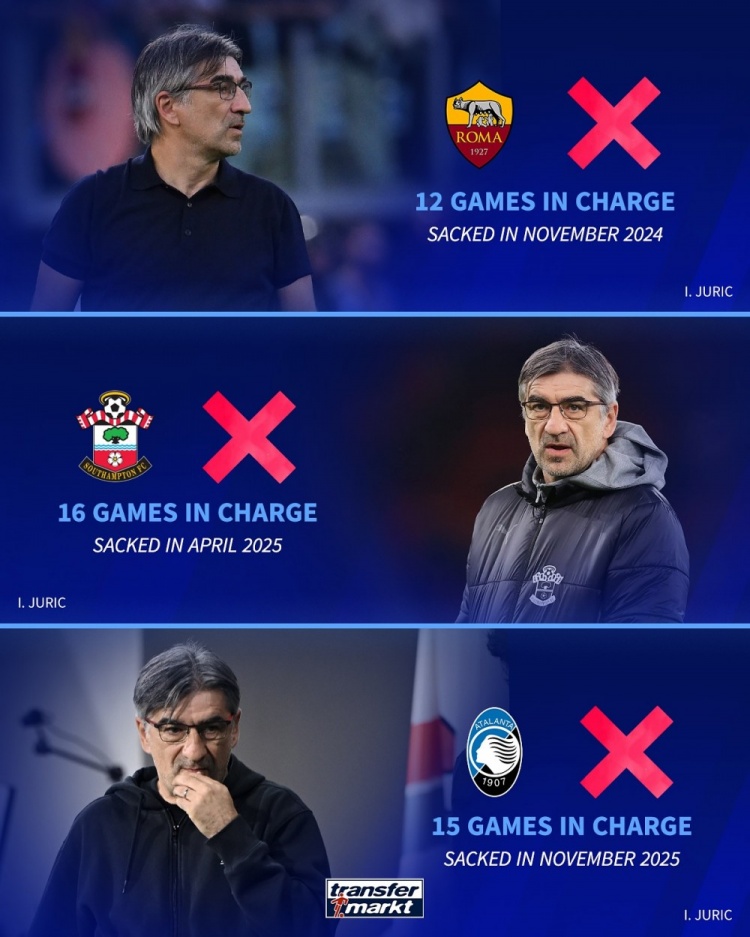 Atlanta announced the dismissal of coach Juric. Juric was fired by three clubs: Roma, Southampton, and Atlanta in one year. The German transfer market listed the list of coaches who were fired by three clubs in the shortest time in this century. Juric occupied two of the top four positions.