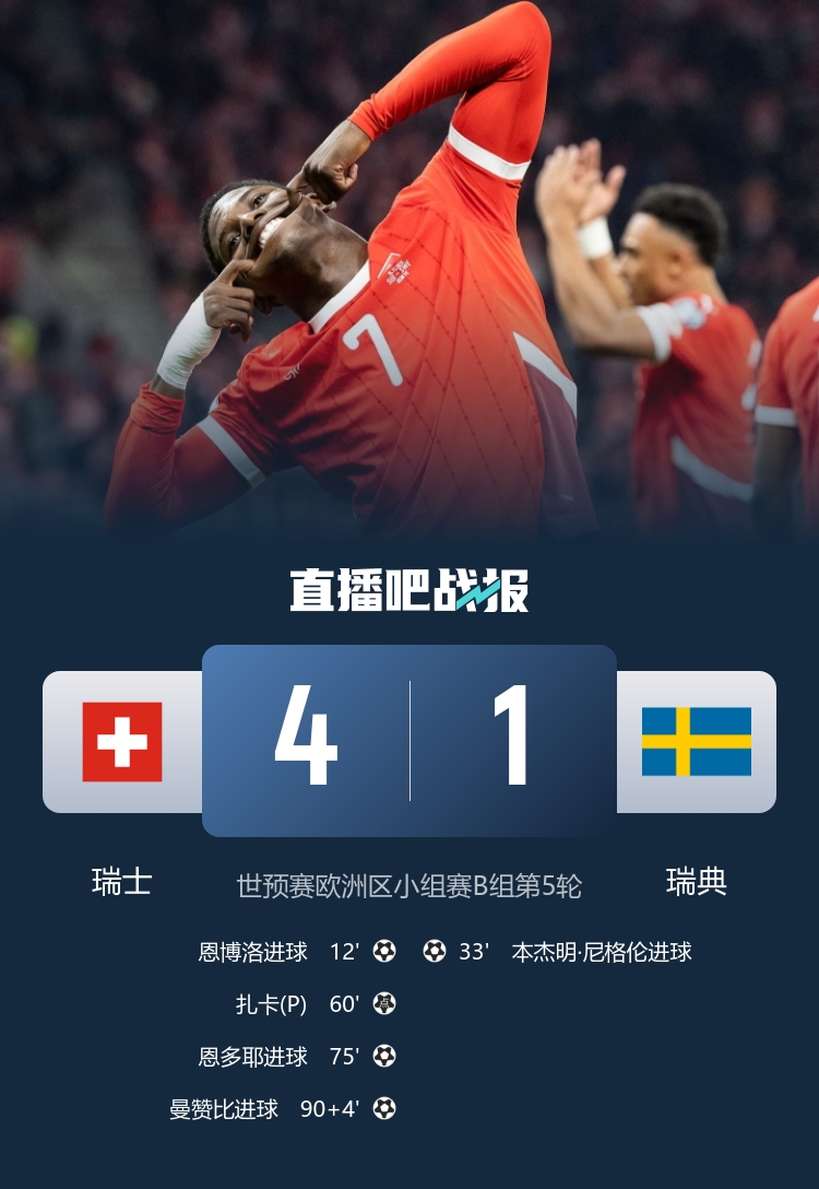 Switzerland 4-1, Sweden is in sight of entering the United States, Canada and Mexico. Xhaka shoots Ndoye's pass. Sweden is at the bottom without a win in 5 rounds.