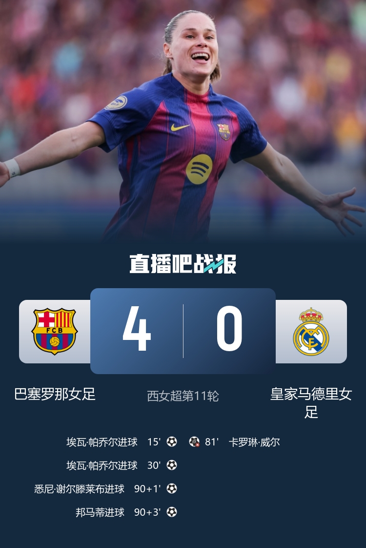 Western Women's Super League-Barcelona Women's Football Team 4-0 Real Madrid Women's Football Team. Pacior's double-click and Bonmati's substitute contribution made Will lose points