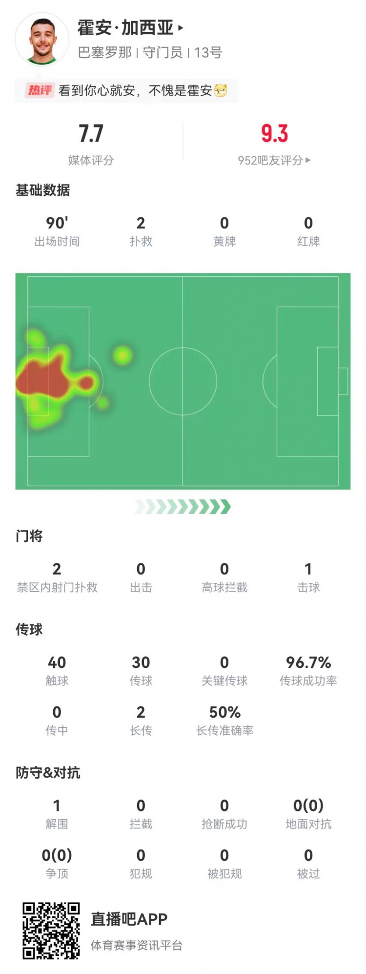 FootballBarcelona defeated Biba 4-0 in this round of La Liga focus match. Juan Garcia's statistics for this game are as follows: Started and played the whole game 2 saves 1 hit 40 touches 30 passes, success rate 96.7% 2 long passes, 1 success 1 clearanc...