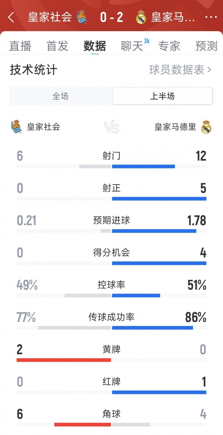 The first half of this round of La Liga Real Madrid's match against Real Sociedad ended. Real Madrid temporarily led 2-0 with one man sent off. The following is the comparison of the half-time data of both sides: