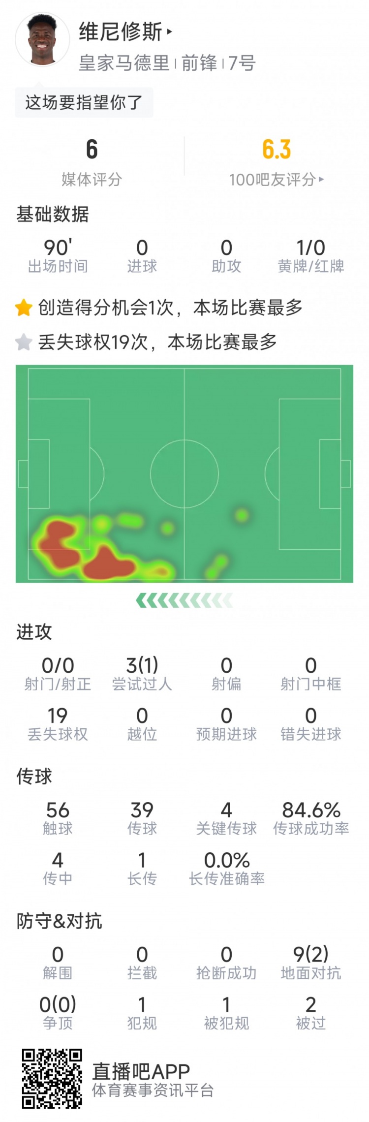 Vinicius statistics for this game: 0 shots, 4 key passes, only 2 successes in 9 confrontations